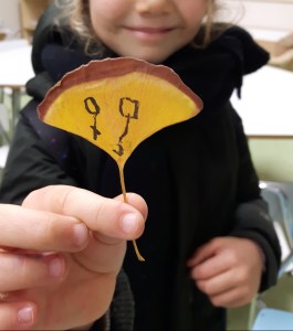 好 La mamma accanto al proprio bambino: calligrafia con china su foglia di Ginkgo Biloba